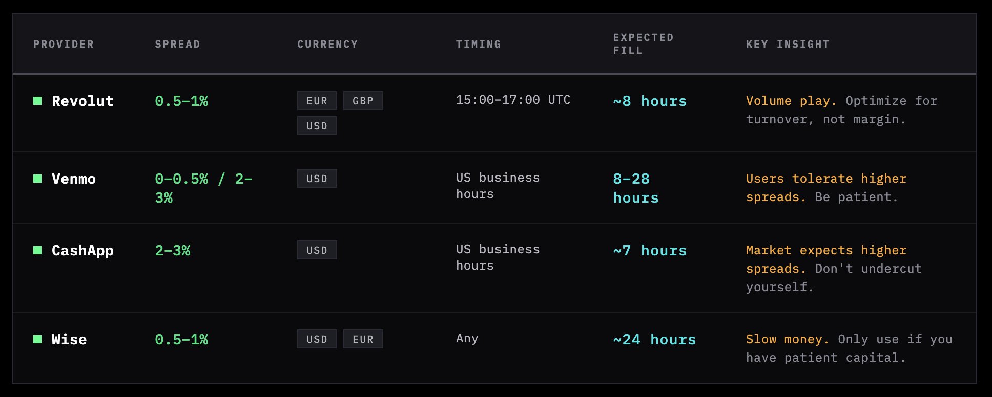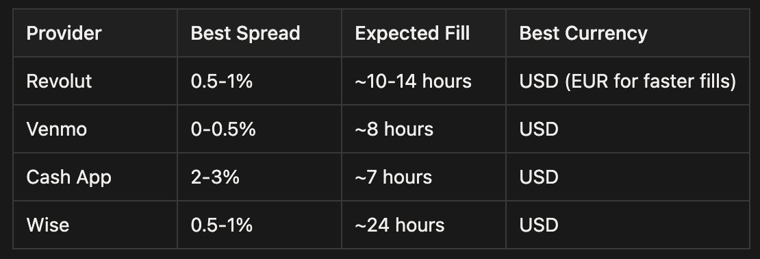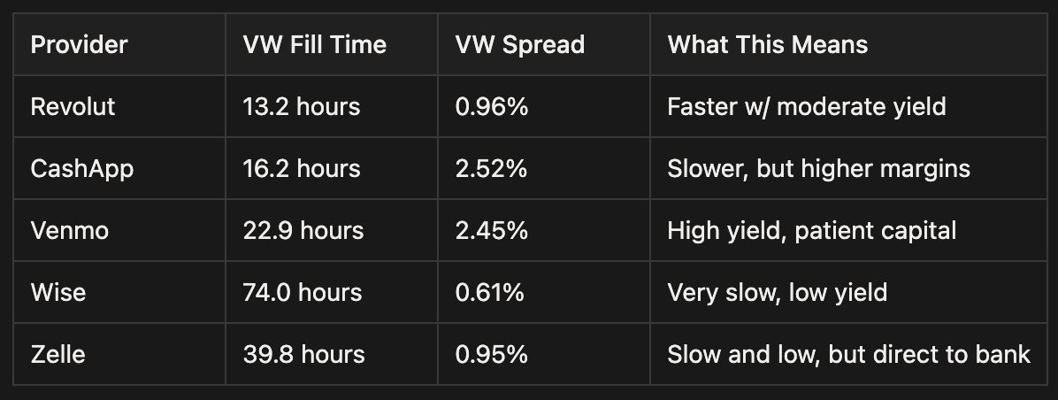 That's ~$100k per day flowing through peer-to-peer rails. For this analysis, I tracked every order from (re)deposit to fill, measuring by time, spread, and provider. This let me calculate the actual time it takes to get the fiat into your account.