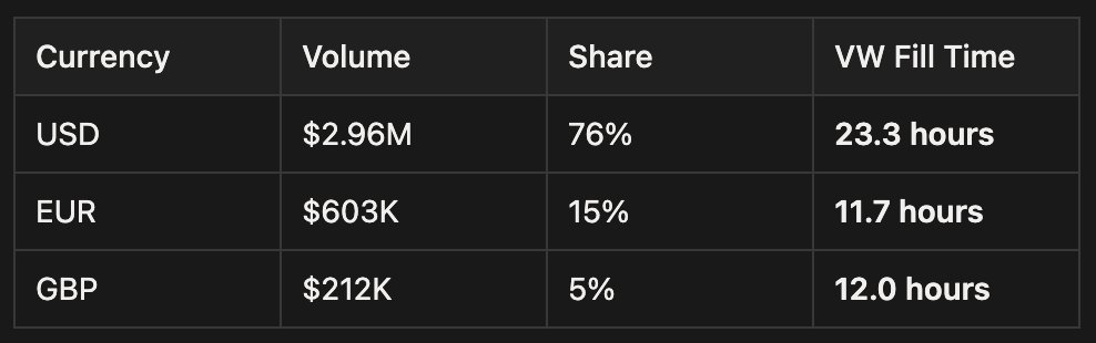 EUR fills 2x faster than USD.