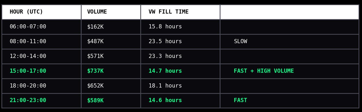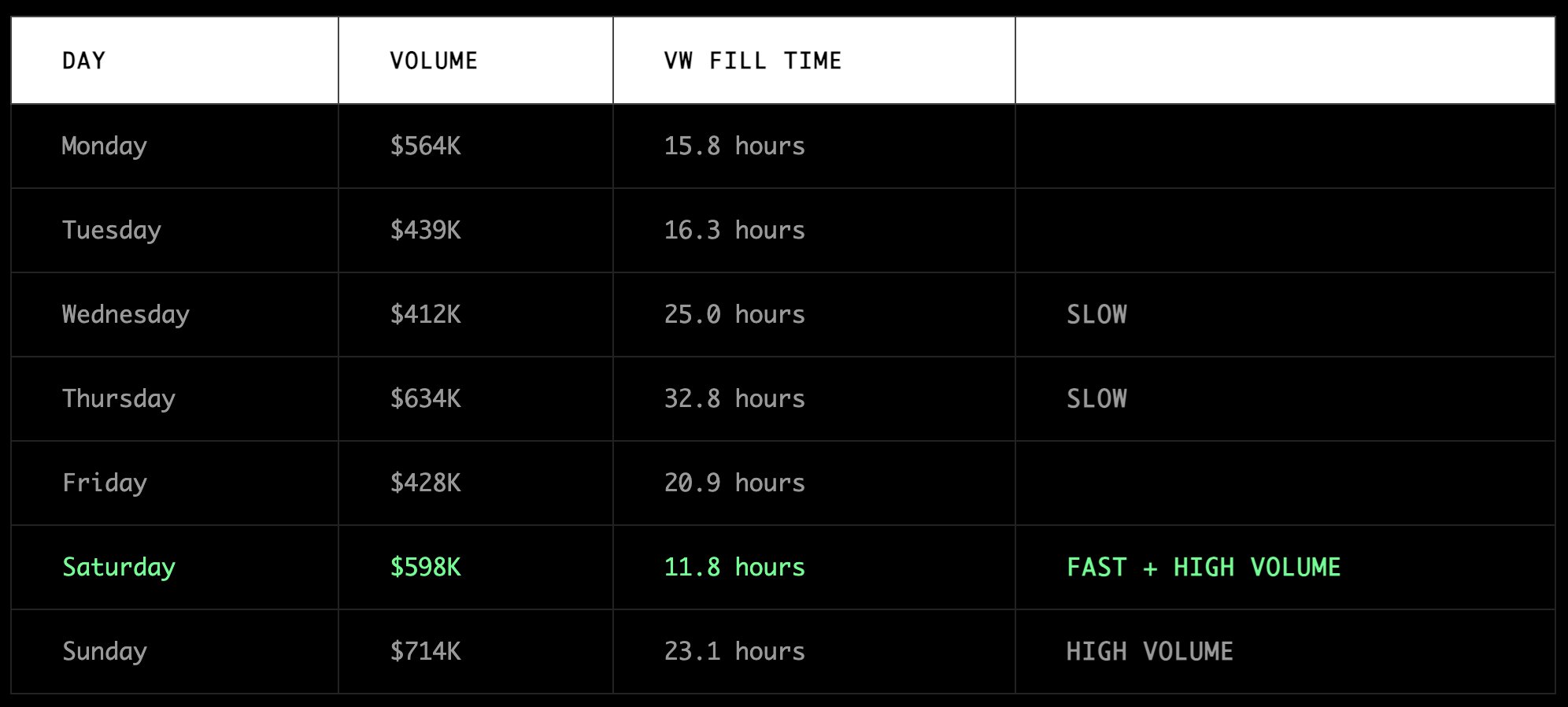 Saturday is the best day of week, fastest fills with strong volume. If you're looking to optimise capital efficiency it looks like you should prepare on Friday for a weekend rush, and rebalance at the start of the week.