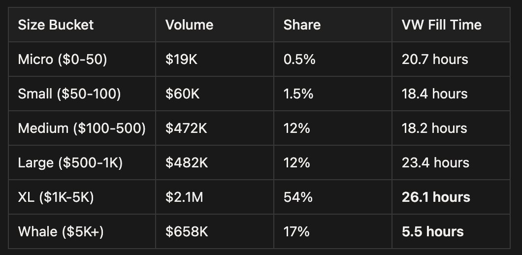 Everyone wants to know the optimal spread, so I've bucketed the transactions by spread range and calculated the volume-weighted fill times: