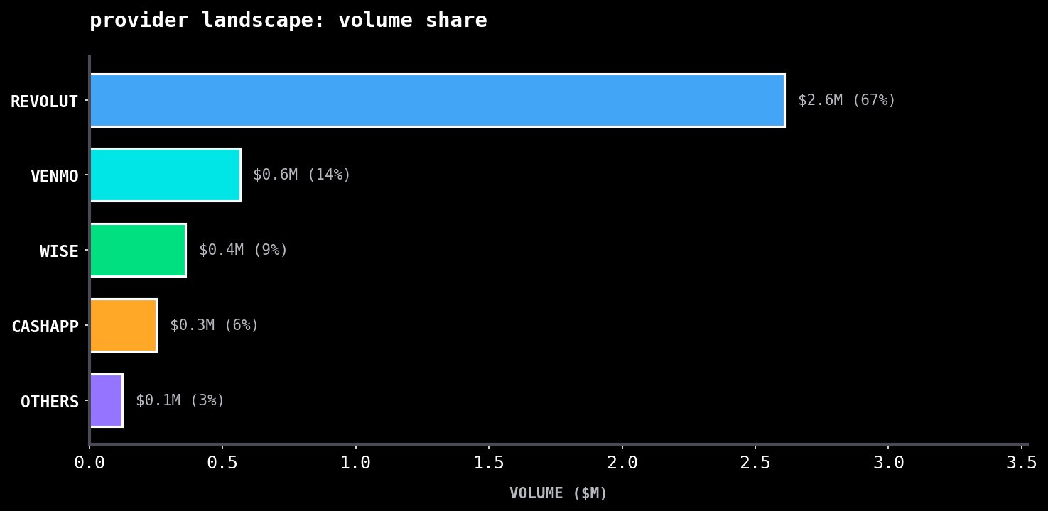 Revolut dominates the volume, capturing 67% of the flows, helped by the fact it is multicurrency. This, however, doesn't tell the full story. Liquidity providers care about two things: