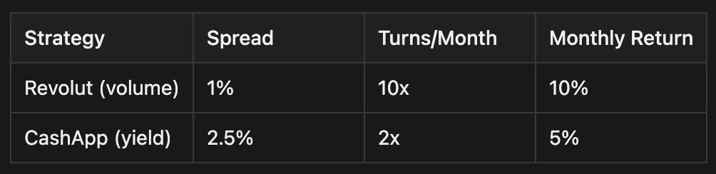 Revolut is optimised for turnover, especially as EU banking doesn't have wait [up to] 5 days for a wire to be received. Cashapp and Venmo are optimised for yield per transactions. If you want to maximise your annual returns, you need to work out how many times you can cycle your capital.