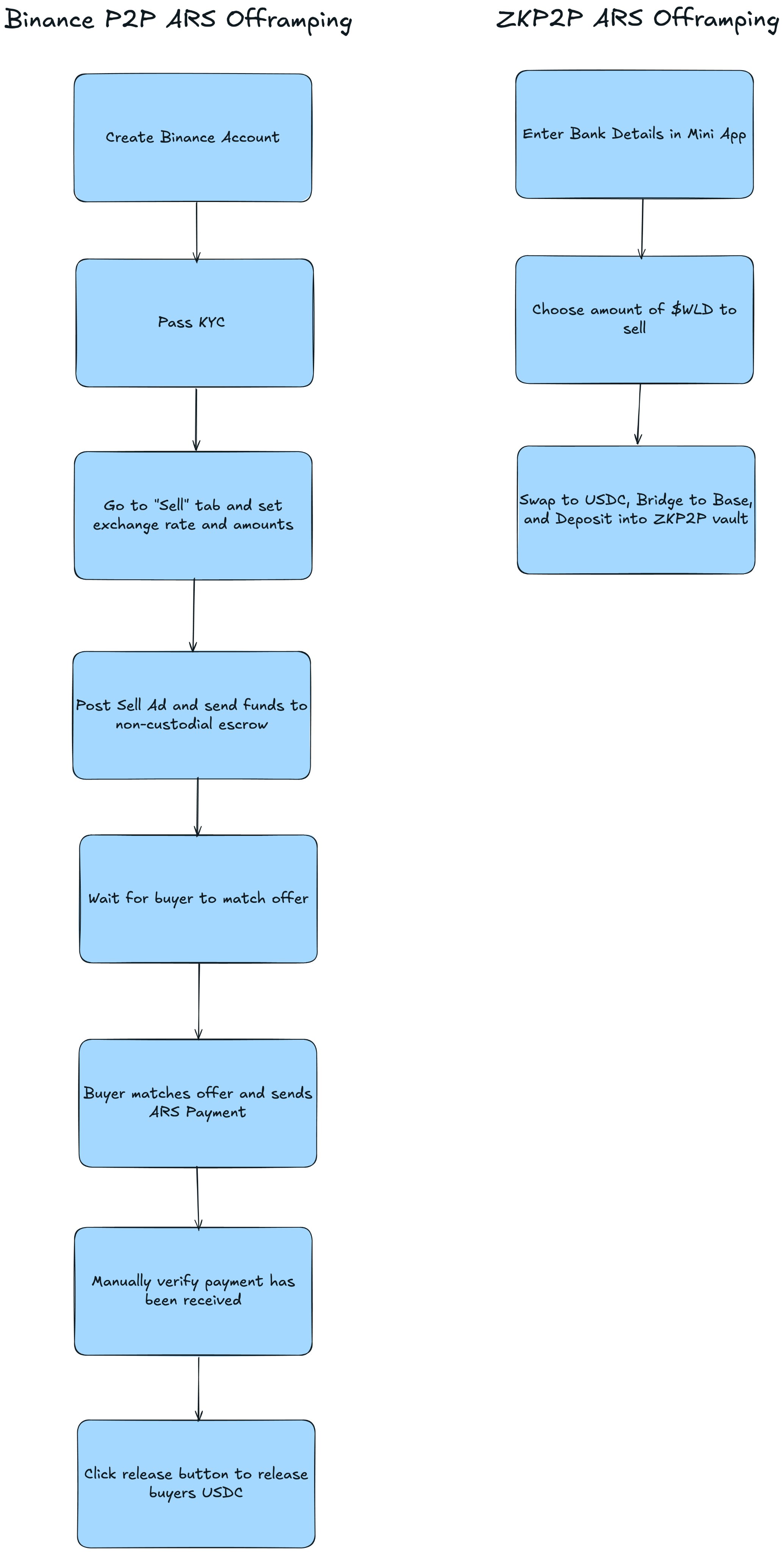 The Mini App users list their USDC at a discount range between 3-5% based on size, incentivising takers to send pesos. This creates a two sided benefit; Argentinians looking to onramp gain access to discounted USDC and those offramping enjoy faster settlement. We expect users to go from $WLD to Pesos in ~15 minutes or less.